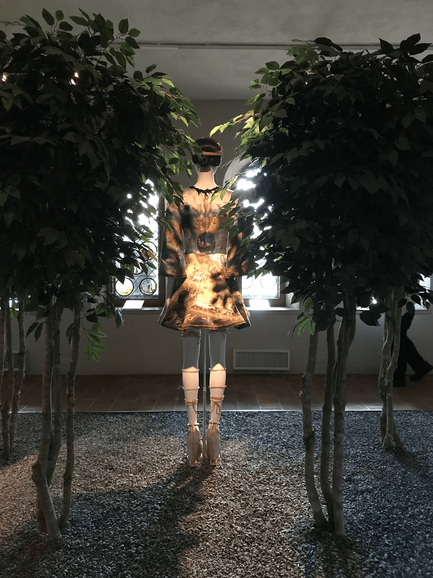 The most convincing and illuminating of the vignettes are those that engage with the collection beyond one-to-one parallels with famous works of medieval art repeated on the clothing. These transcriptions, like the dresses by Jun Takahashi dispersed in the “Garden of Eden” runway, are gorgeous but gratuitous, as are Alexander McQueen’s ensembles in the Late Gothic gallery.