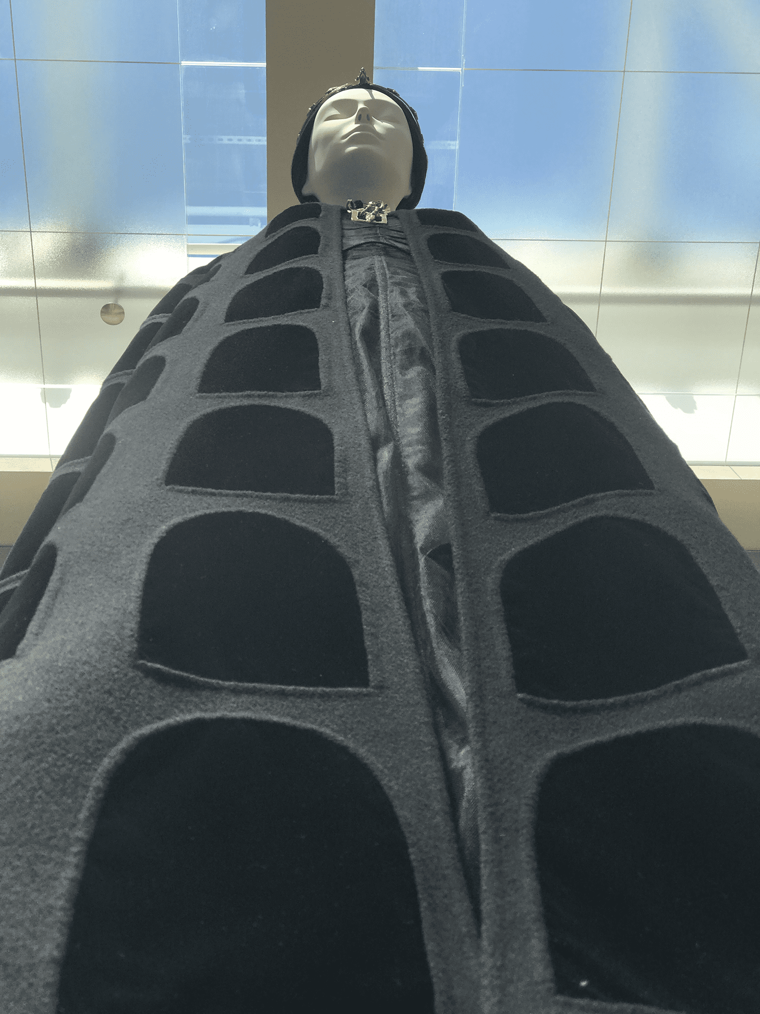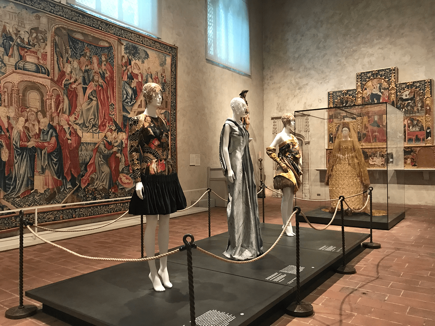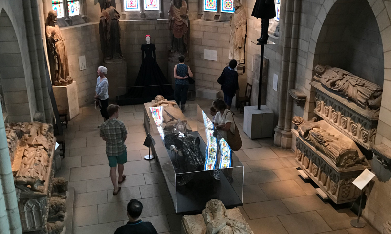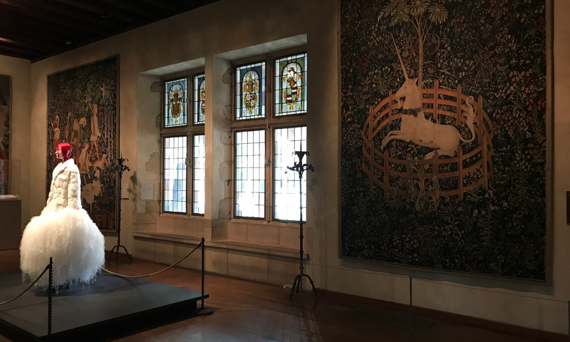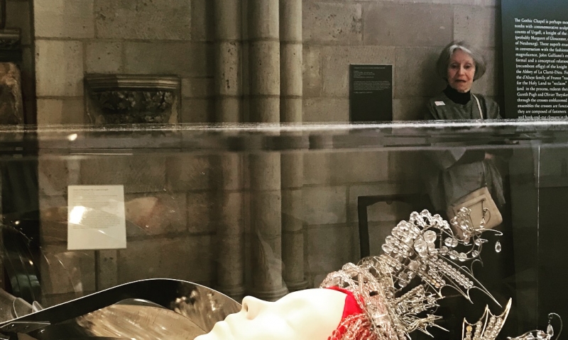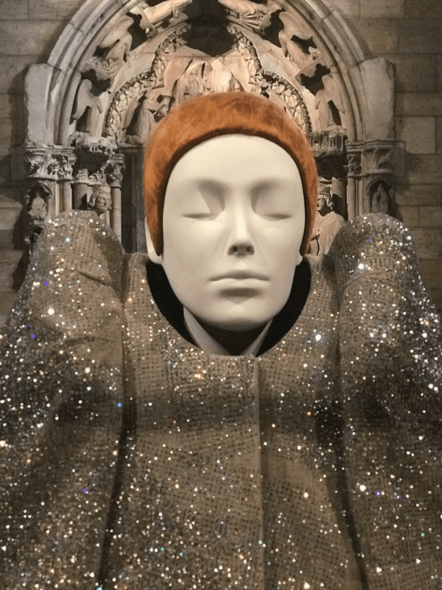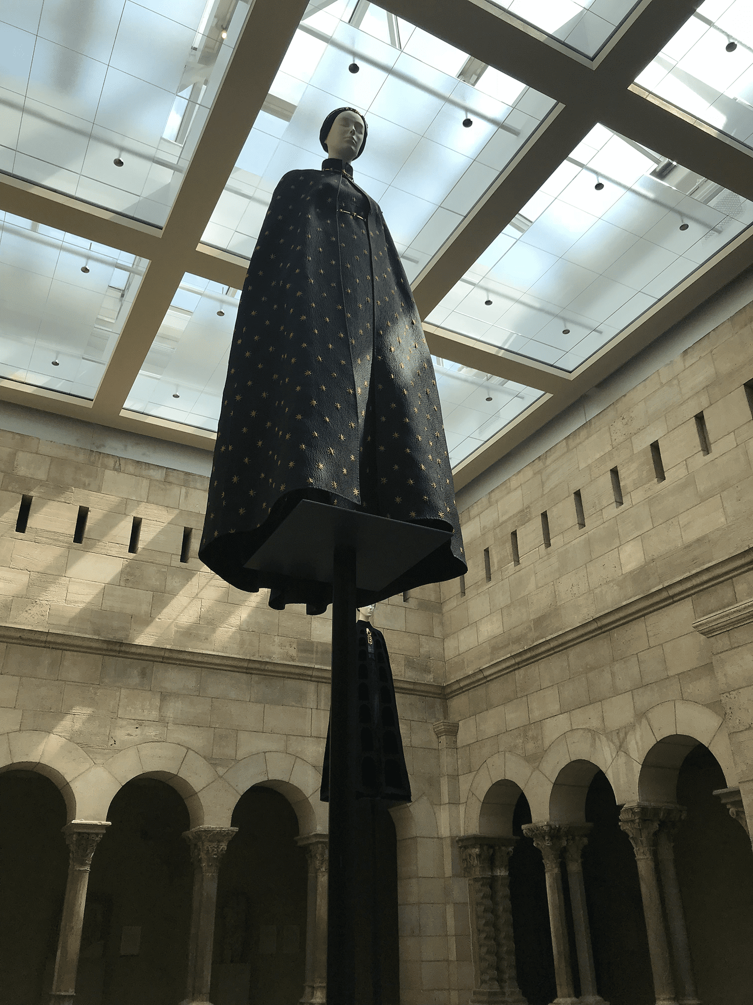 The “authentic disharmonies” of Mumford’s Cloisters, “not so much an honest relic as a wish,” are brought into productive tension through the animation of its most recent exhibition, Heavenly Bodies: Fashion and the Catholic Imagination. In this exhibition, purposeful anachronisms of period rooms and modern costumery join to create cohesive desires, unmoored from historical boundedness. This exhibition is curated by Andrew Bolton and installed throughout the Met Cloisters, in the Medieval Galleries, the Robert Lehman Wing, and the Costume Institute at the Met Fifth Avenue. This essay focuses on the installation at the Cloisters for a few reasons: because I have been a lecturer there for over a decade, and thus am intimately familiar with the space; because of the unity of the Cloisters’ installation; and, finally, due to the museological issues raised specifically by its status as a series of interconnected period rooms.2