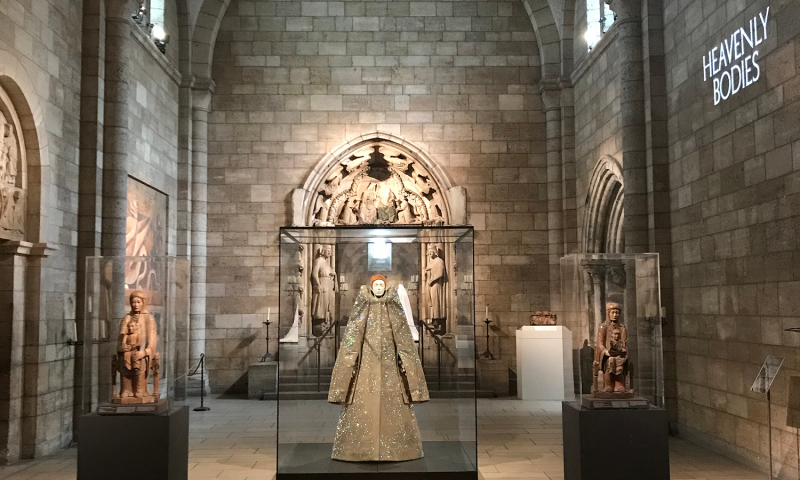 - It should be noted that throughout the exhibition there is also an aural component: “Ave Maria” plays in the Romanesque Hall, the Langon Chapel, the St. Guilhem cloister, and the Fuentidueña gallery; other musical excerpts in the exhibition (in other galleries at the Cloisters and the Met Fifth Avenue) include “Chasing Sheep is Best Left to Shepherds” by Michael Nyman, “On Earth as it is in Heaven” by Ennio Morricone (from the soundtrack for the film The Mission), “Concerto en Mi Mineur, version de 1798” Zbigniew Preisner (used in the film La Double Vie de Veronique), and an aria from the opera La Wally (1892) by Alfredo Catalani. My thanks to Nancy Wu, Senior Managing Museum Educator at the Met Cloisters, for providing this information. The music serves more as a distraction than ambiance, as Jason Farago noted in a review of the exhibition: “Playing in the medieval sculpture hall is an intolerable loop of staccato string accompaniment . . . that will make you wish the Costume Institute would take a Cistercian vow of silence.” Farago, “‘Heavenly Bodies’ Brings the Fabric of Faith to the Met,” New York Times, May 8, 2018, at https://www.nytimes.com/2018/05/09/arts/design/heavenly-bodies-met-costumes.html, as of July 16, 2018. ↩
