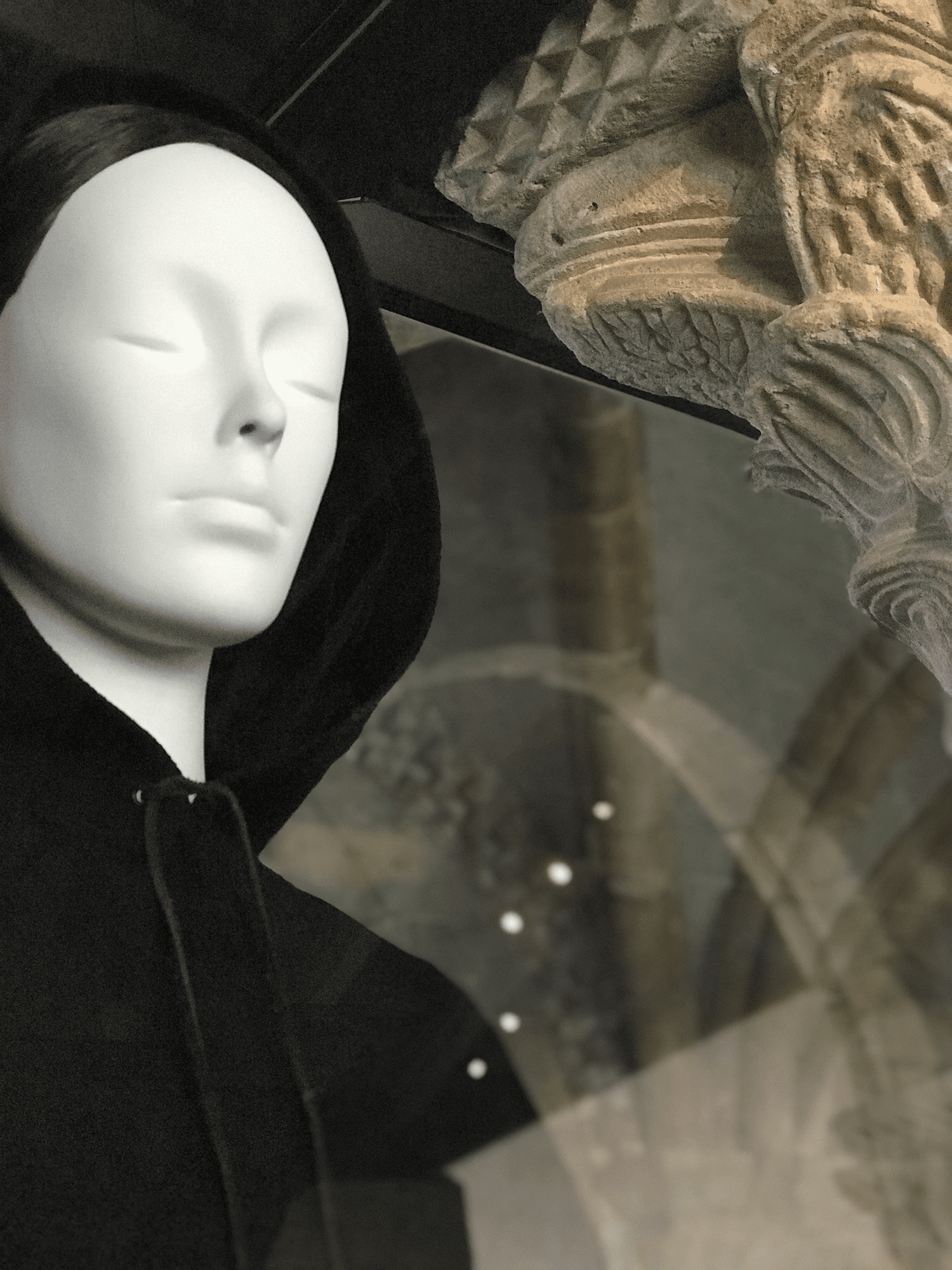Yet, in Heavenly Bodies, “monks” populate the cloister, as part of the display, as never before. The two ensembles in the St. Guilhem cloister, both by Valentino (Fall/Winter 2015–2016), are elevated by way of mounts that suspend them in the second story of the cloister; both wear cashmere capes that recall the black habits of Benedictine monks, who would have occupied the cloister in the medieval period. Again, out of reach, viewers are denied engagement with these “heavenly bodies,” which enables us to step back and consider actor and architecture in active dialogue with one another. As Alexander Potts has shrewdly observed, we are less likely to appreciate scale with our own bodies than when we witness its effect on other bodies. Because we observe this interaction between actor and object from a distance, “the viewer is simultaneously drawn inside and made to feel displaced.”19