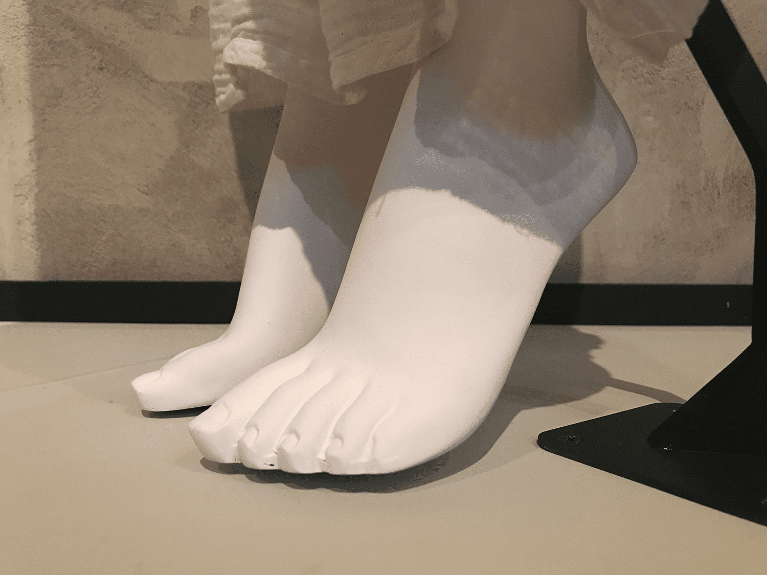 Each gallery at the museum is populated with dressed mannequins that relate to the collection thematically, formally, or performatively. The mannequins were manufactured specifically for the exhibition; Bolton went back and forth with the sculptor multiple times to ensure that their expression bore a sense of reverence. Initially Bolton’s idea was to duplicate the face of the Virgin Mary in Michelangelo’s Pietà (1498–1499), which proved difficult; yet the overall demeanor of Michelangelo’s Virgin is preserved.7 Both the male and female mannequins have their eyes closed, their chins tilted slightly upward, and stand on their tiptoes: the effect is one of an active repose, alert and humble, deferential and quietly assertive, as if responding to the palpable presence of the divine in the now-defunct apse, cloister, chapel, and chapterhouse.