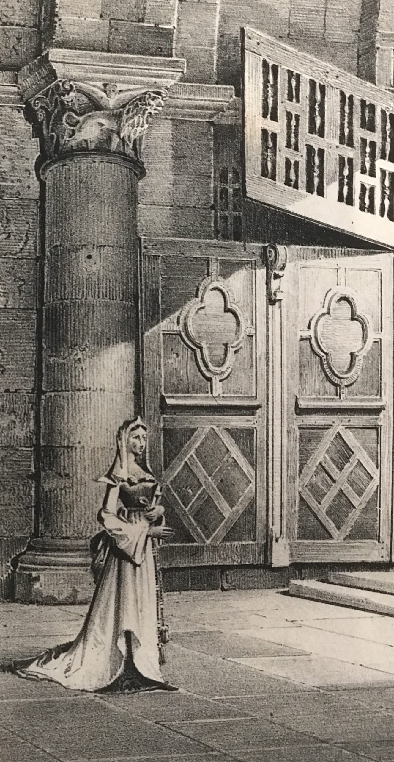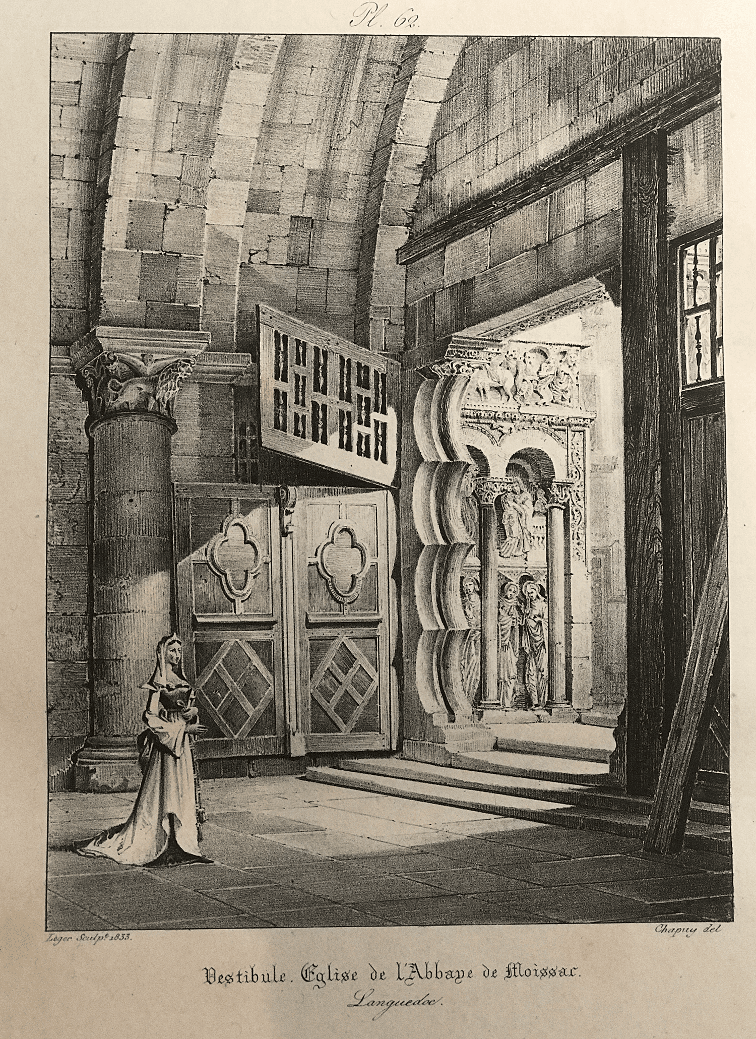 These lithographs conflate medieval and modern time through their vignettes of actors engaged in a variety of activities. In some, local townsfolk appear oblivious to the ancient ruins, and in others, single figures of aristocratic origin are absorbed in acts of piety.15 When I first saw the installation of a bride at the threshold to the apse of the Romanesque church of St. Martin from Fuentidueña, I was immediately transported to an image from the Voyages of a medieval woman standing at a threshold in a different place: the narthex of the Romanesque abbey of Moissac in Languedoc, France.